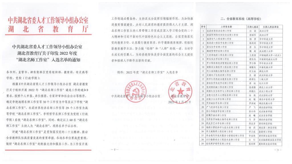 近日,湖北省委人才工作领导小组办公室、湖北省教育厅公布了2022年度“湖北名师工作室”入选名单,公司李立威教授主持的制药工程名师工作室成功入选,同时确定该工作室主持人李立威为“湖北名师”。
