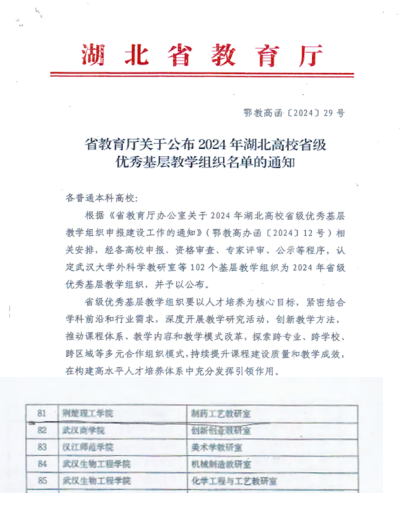 12月13日,湖北省教育厅公布了2024年湖北高校省级优秀基层教学组织名单,公司制药工艺教研室位列其中。